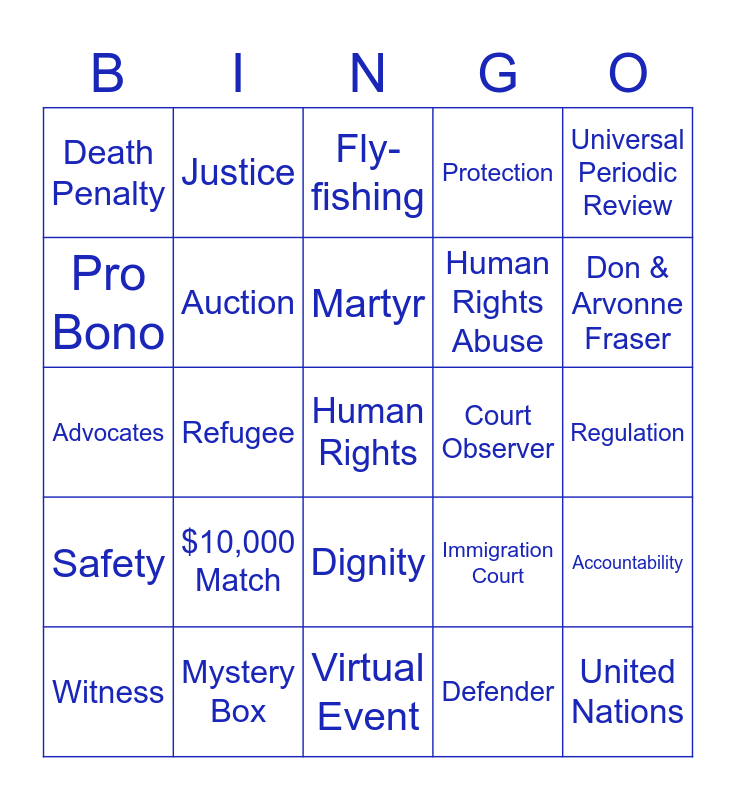 This bingo card has a free space and 29 words: Witness, Volunteer, Refugee, Women's Rights, Death Penalty, Fly-fishing, Auction, $10,000 Match, Court Observer, Mystery Box, Regulation, United Nations, Virtual Event, Defender, Don & Arvonne Fraser, Asylum, Dignity, Safety, Universal Periodic Review, Advocates, Immigration Court, $200,000, Human Rights Abuse, Pro Bono, Protection, Justice, Accountability, Martyr and Intern.