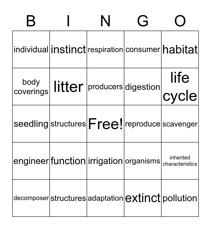 This bingo card has a free space and 24 words: function, structures, producers, decomposer, habitat, individual, body coverings, instinct, reproduce, irrigation, digestion, seedling, organisms, inherited characteristics, litter, extinct, scavenger, respiration, life cycle, structures, pollution, engineer, consumer and adaptation.