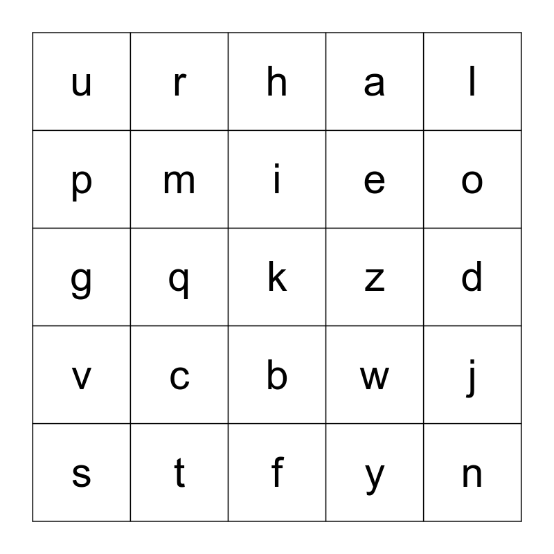 This bingo card has 25 words: c, f, i, s, l, u, p, r, z, b, e, g, w, j, m, n, d, h, o, q, k, t, v, a and y.