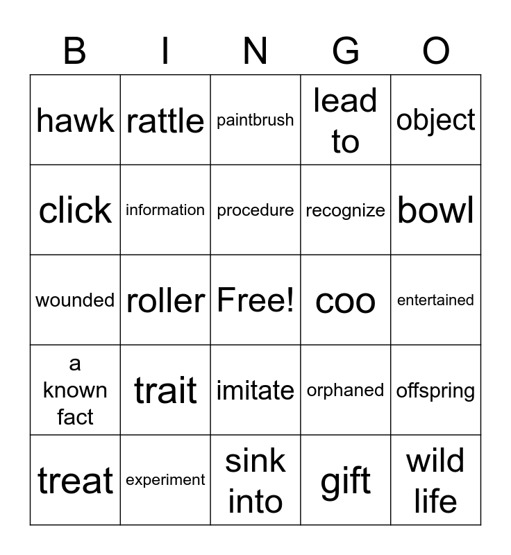 This bingo card has a free space and 24 words: trait, experiment, procedure, treat, object, hawk, click, rattle, coo, imitate, recognize, wounded, orphaned, offspring, information, gift, entertained, paintbrush, bowl, roller, wild life, a known fact, lead to and sink into.