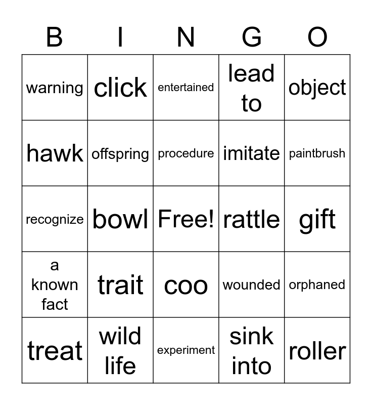 This bingo card has a free space and 25 words: trait, experiment, procedure, treat, object, warning, hawk, click, rattle, coo, imitate, recognize, wounded, orphaned, offspring, information, gift, entertained, paintbrush, bowl, roller, wild life, a known fact, lead to and sink into.