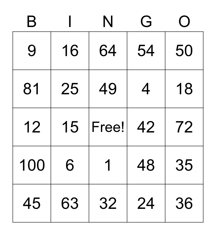 This bingo card has a free space and 24 words: 6, 63, 49, 45, 50, 9, 81, 16, 42, 1, 4, 12, 48, 35, 25, 24, 72, 64, 18, 15, 36, 100, 54 and 32.