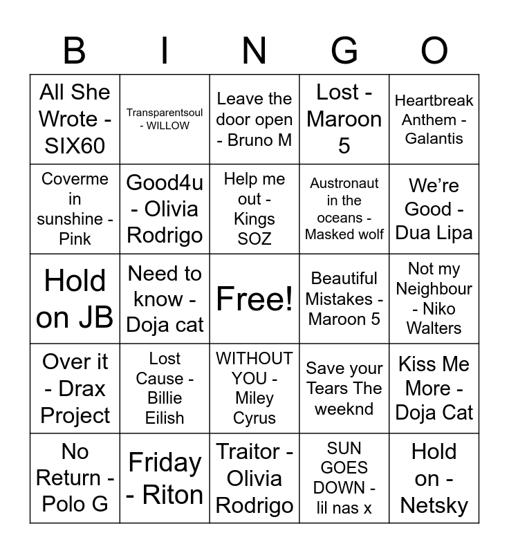 This bingo card has a free space and 37 words: Love on the Run - Sons of Zion, Solar Power - Lorde, Run - One Republic, Good4u - Olivia Rodrigo, Kiss Me More - Doja Cat, Lost Cause - Billie Eilish, Help me out - Kings SOZ, Our song - Anne Marie, Heartbreak Anthem - Galantis, MONTERO - Lil Nas X, Need to know -Doja cat, Lost -Maroon 5, Hold on - Netsky, Not my Neighbour - Niko Walters, Coverme in sunshine - Pink, Over it - Drax Project, Body - Tion Wayne, Leave the door open - Bruno M, WITHOUT YOU - Miley Cyrus, Beautiful Mistakes - Maroon 5, All She Wrote - SIX60, We’re Good - Dua Lipa, No Return - Polo G, Traitor - Olivia Rodrigo, Younger - TTKS, SUN GOES DOWN - lil nas x, Transparentsoul - WILLOW, Peaches - JB, Lasting Lover - Sigala, Dejavu - Olivia Rodrigo, Levitating - Dua Lipa, Friday - Riton, Hold on JB, Band AJR, Save your Tears The weeknd, Austronaut in the oceans - Masked wolf and What other people say- Sam Fischer.