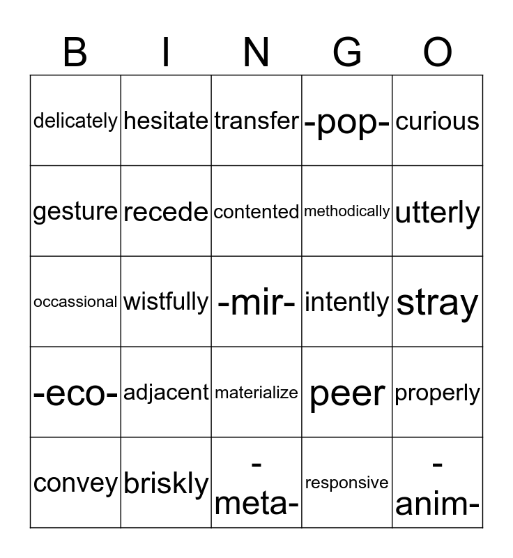 This bingo card has a free space and 24 words: adjacent, briskly, contented, convey, curious, delicately, gesture, hesitate, intently, materialize, methodically, occassional, peer, properly, recede, responsive, stray, transfer, utterly, wistfully, -anim-, -eco-, -pop- and -meta-.