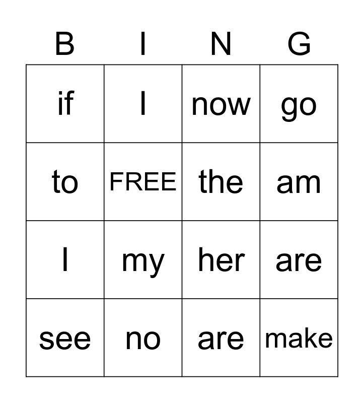 This bingo card has 52 words: a, see, look, here, my, me, I, can, FREE, like, the, said, is, it, go, we, am, no, on, to, are, you, if, I, see, look, here, me, my, is, it, go, can, we, like, now, the, day, on, a, to, are, make, if, this, at, he, her, she, his, little and come.