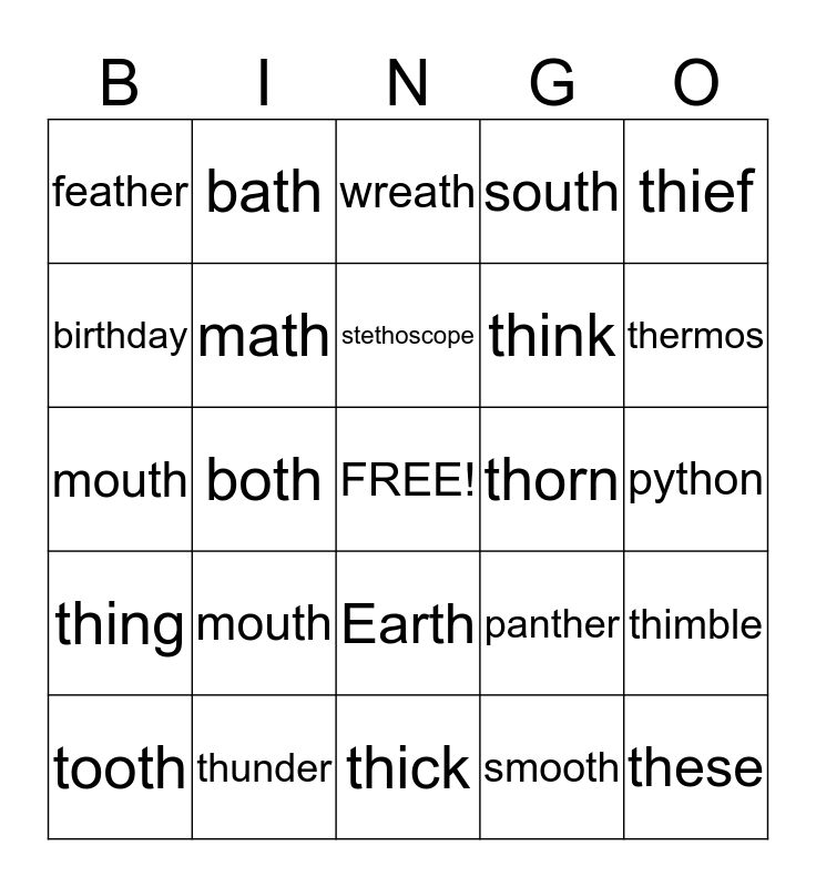 This bingo card has a free space and 24 words: mouth, thunder, stethoscope, tooth, thief, feather, birthday, bath, thorn, Earth, think, mouth, panther, thimble, math, smooth, python, wreath, thermos, both, these, thing, south and thick.