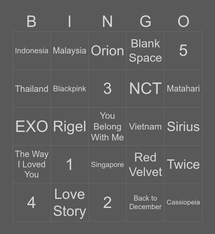 This bingo card has 25 words: 1, 2, 3, 4, 5, Indonesia, Thailand, Malaysia, Vietnam, Singapore, NCT, EXO, Red Velvet, Twice, Blackpink, Cassiopeia, Sirius, Orion, Matahari, Rigel, You Belong With Me, Love Story, The Way I Loved You, Blank Space and Back to December.