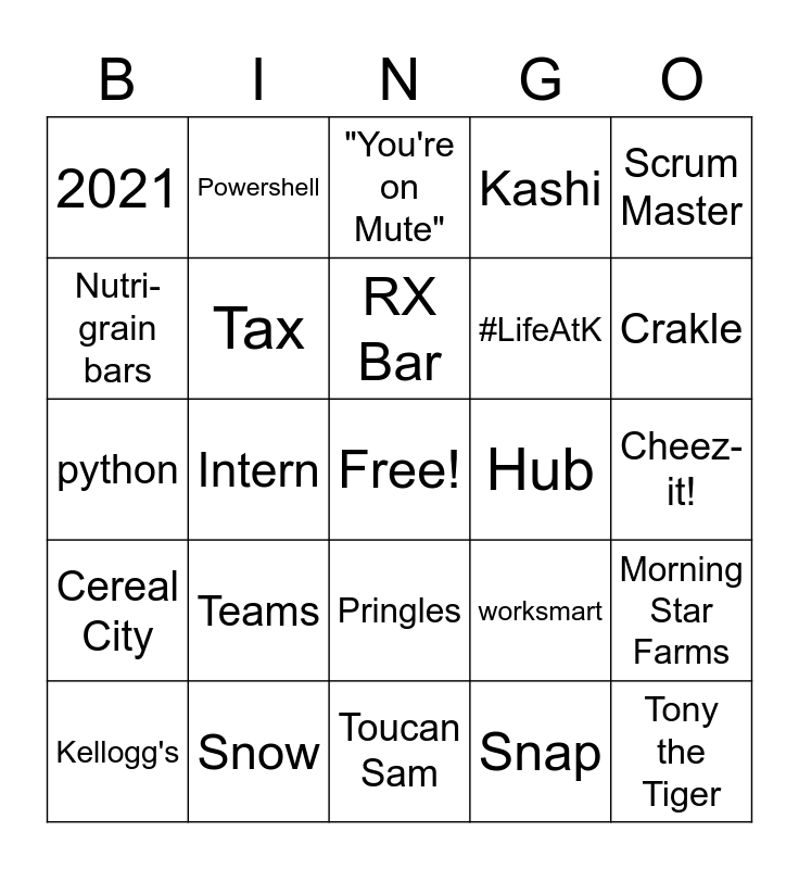 This bingo card has a free space and 29 words: Kellogg's, IT, Intern, Summer, 2021, "You're on Mute", Tax, Teams, Hub, Snow, Cheez-it!, Tony the Tiger, Toucan Sam, Snap, Crakle, Pop, Pringles, Cereal City, Scrum Master, python, worksmart, Kapable, #LifeAtK, Nutri-grain bars, Kashi, Powershell, Morning Star Farms, RX Bar and Sharepoint.