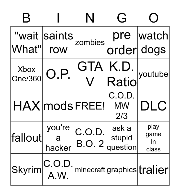 This bingo card has a free space and 24 words: you're a hacker, C.O.D. A.W., GTA V, Skyrim, watch dogs, "wait What", Xbox One/360, saints row, C.O.D. MW 2/3, C.O.D. B.O. 2, K.D. Ratio, HAX, ask a stupid question, play game in class, O.P., graphics, DLC, zombies, youtube, mods, tralier, fallout, pre order and minecraft.