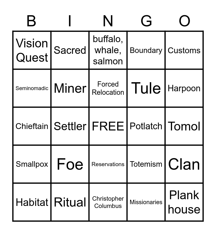 This bingo card has a free space and 24 words: Foe, Ritual, Forced Relocation, Habitat, Customs, Vision Quest, Seminomadic, Sacred, Potlatch, Reservations, Tule, Chieftain, Totemism, Clan, Miner, Missionaries, Tomol, buffalo, whale, salmon, Harpoon, Settler, Plank house, Smallpox, Boundary and Christopher Columbus.