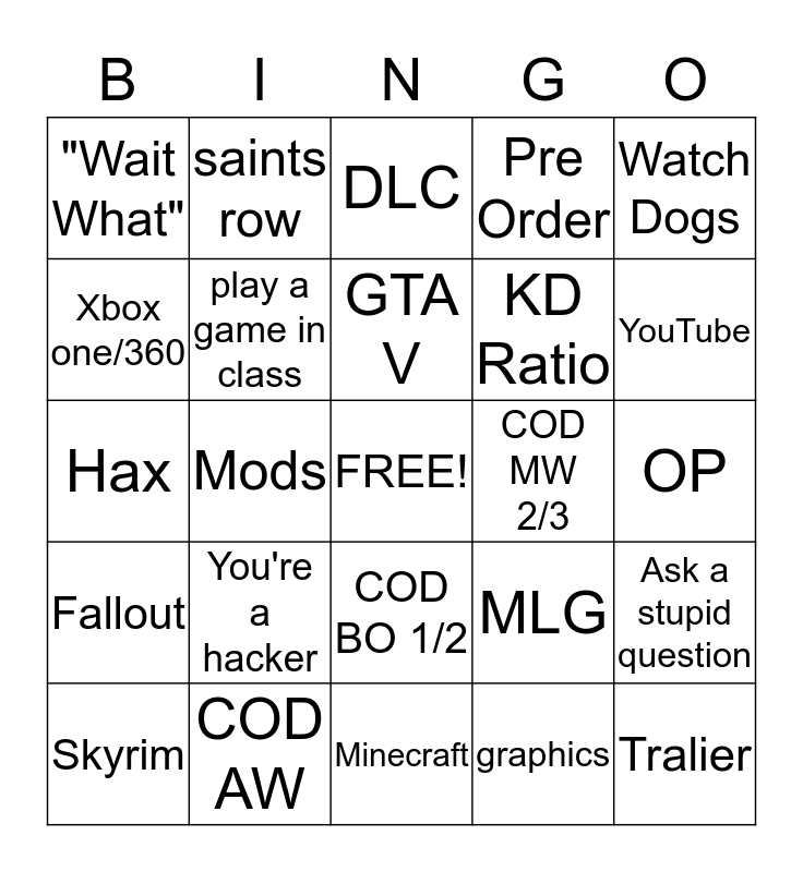 This bingo card has a free space and 24 words: You're a hacker, COD AW, GTA V, Skyrim, Watch Dogs, "Wait What", Xbox one/360, saints row, COD MW 2/3, COD BO 1/2, KD Ratio, Hax, MLG, Ask a stupid question, play a game in class, graphics, OP, DLC, YouTube, Mods, Tralier, Fallout, Pre Order and Minecraft.