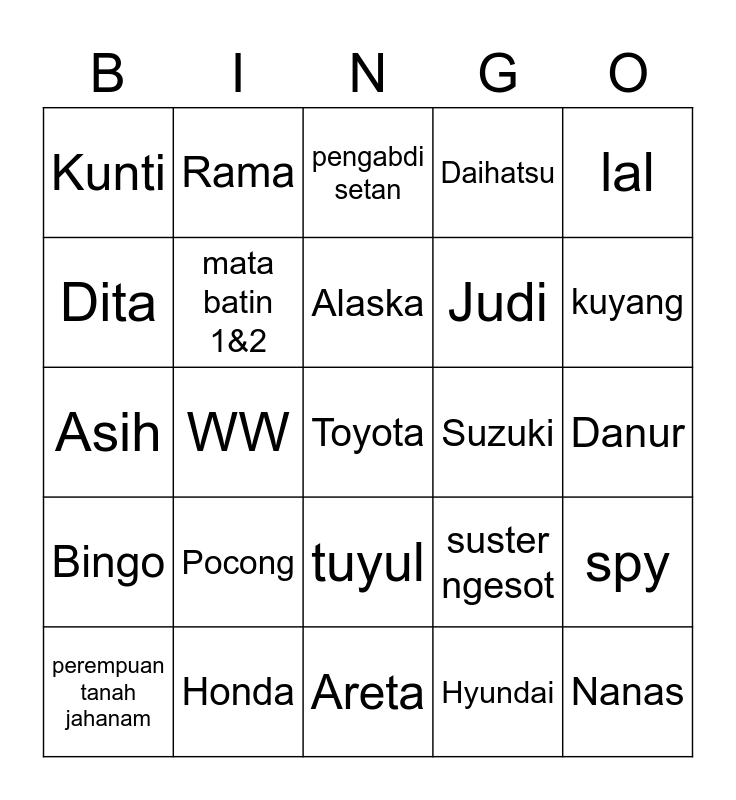 This bingo card has a free space and 24 words: perempuan tanah jahanam, Pocong, Alaska, Hyundai, lal, Kunti, Rama, pengabdi setan, Suzuki, Danur, Asih, mata batin 1&2, suster ngesot, spy, Dita, Honda, Areta, Daihatsu, kuyang, Bingo, WW, tuyul, Judi and Nanas.
