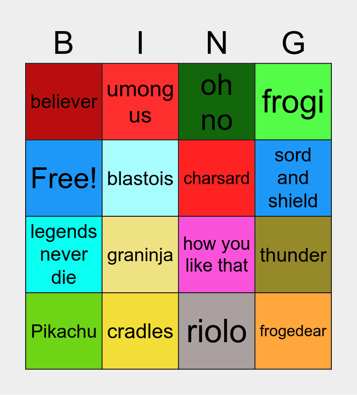 This bingo card has 16 words: cradles, thunder, oh no, believer, legends never die, umong us, how you like that, riolo, Free!, blastois, Pikachu, frogi, graninja, sord and shield, charsard and frogedear.