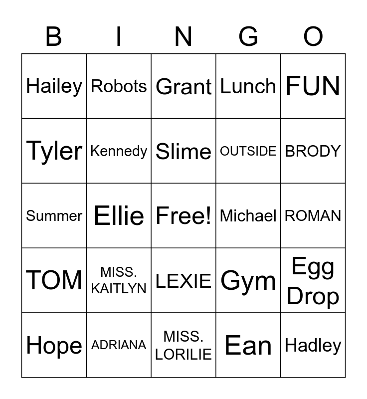 This bingo card has a free space and 29 words: Hope, Mackenzie, Ellie, MICKY, Hailey, Grant, Kennedy, MISS. KAITLYN, Michael, ADRIANA, ROMAN, Hadley, MISS. LORILIE, Ean, BRODY, STEM, LEXIE, TOM, FUN, Summer, Gym, OLIVIA, OUTSIDE, Tyler, Lunch, Robots, Egg Drop, Slime and Lava Lamp.