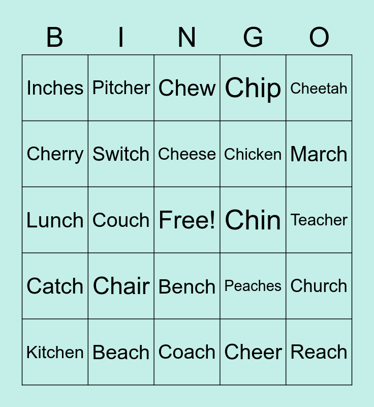 This bingo card has a free space and 24 words: Chair, Beach, Cheese, Kitchen, Cheetah, Inches, Cherry, Pitcher, Chin, Bench, Chicken, Lunch, Peaches, Church, Switch, Cheer, Teacher, Chew, March, Couch, Reach, Catch, Chip and Coach.