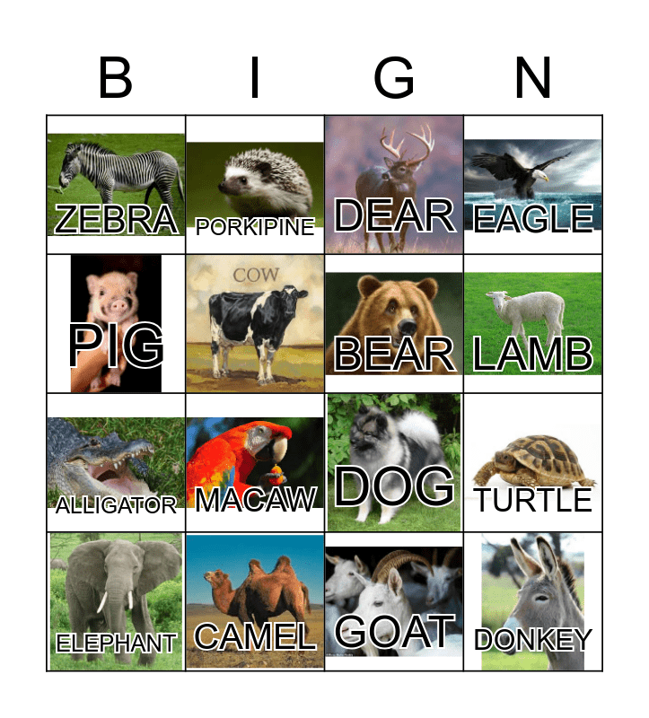 This bingo card has 37 images and 36 words: FREE, PANDA, TIGER, BEAR, HORSE, GIRRAFE, LAMB, LION, PIG, ALLIGATOR, TURTLE, EAGLE, ELEPHANT, GOAT, DONKEY, FOX, DEAR, MONKEY, CAMEL, ZEBRA, KANGAROO, MACAW, SNAKE, POSSUM, PEACOCK, ROSTER, RACOON, DUCK, SQUIRELL, TURKEY, FROG, PORKIPINE, OWL, CAT, DOG and RABBIT.