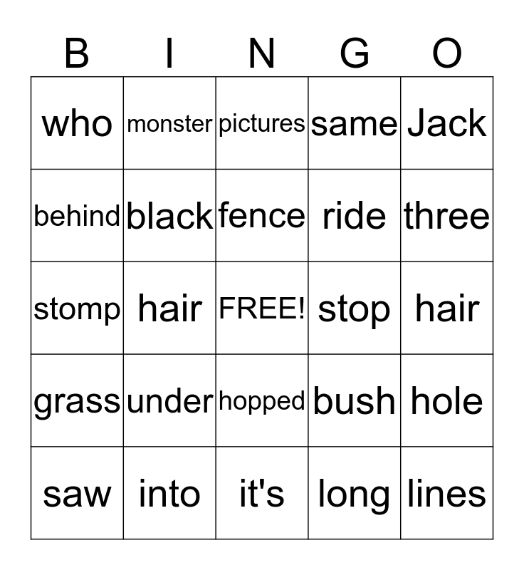 This bingo card has a free space and 24 words: under, into, fence, saw, Jack, who, behind, monster, stop, hopped, ride, stomp, bush, hole, black, long, hair, pictures, three, hair, lines, grass, same and it's.