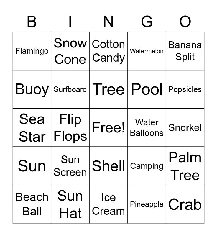 This bingo card has a free space and 29 words: Beach Ball, Chalk, Flip Flops, Sand Castle, Flamingo, Cotton Candy, Surfboard, Sun Screen, Water Balloons, Sun Hat, Snorkel, Crab, Ice Cream, Pineapple, Popsicles, Sunglasses, Shell, Sun, Banana Split, Sea Star, Camping, Kayak, Pool, Buoy, Watermelon, Snow Cone, Palm Tree, Tree and Beach.