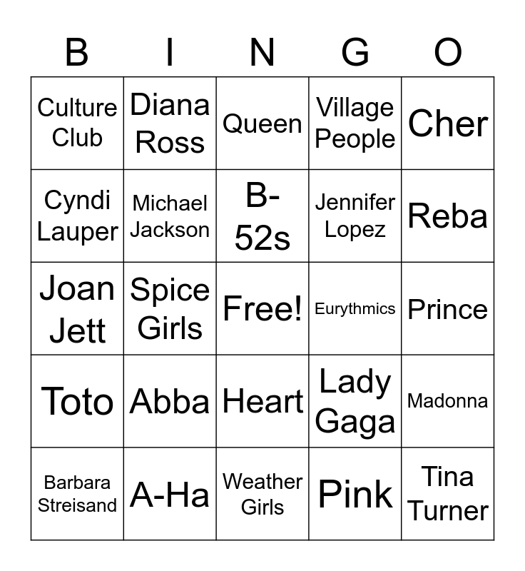 This bingo card has a free space and 24 words: Abba, A-Ha, B-52s, Barbara Streisand, Cher, Culture Club, Cyndi Lauper, Diana Ross, Eurythmics, Heart, Jennifer Lopez, Joan Jett, Lady Gaga, Madonna, Michael Jackson, Pink, Prince, Queen, Reba, Spice Girls, Tina Turner, Toto, Village People and Weather Girls.