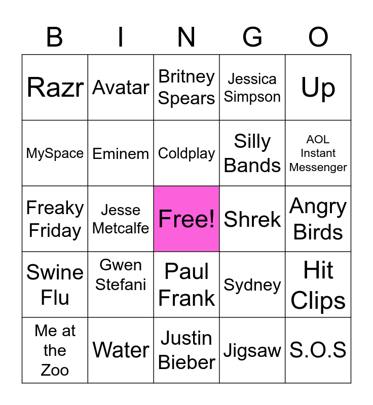 This bingo card has a free space and 39 words: Katrina, J.K. Rowling, Arnold Schwarzenegger, Eminem, Me at the Zoo, Paul Frank, Coldplay, The Surreal Life, Up, Swine Flu, Jesse Metcalfe, Jessica Simpson, S.O.S, Angry Birds, Shrek, Gwen Stefani, Fergie, Razr, Razor, Sydney, MySpace, Justin Bieber, Silly Bands, AOL Instant Messenger, 2008, 2007, 2001, Rafael Nadal, 2003, Avatar, Nelly, Britney Spears, Britney Spears, Water, Jigsaw, The Simple Life, Hit Clips, Freaky Friday and Halle Berry.