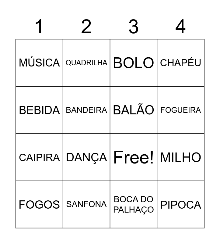 This bingo card has 22 words: SANFONA, BINGO, QUADRILHA, VIOLÃO, BANDEIRA, BALÃO, MÚSICA, BOLO, Free!, PIPOCA, CAIPIRA, CHAPÉU, MAÇÃ, PESCARIA, BOCA DO PALHAÇO, ARGOLAS, MILHO, FOGOS, DANÇA, BEBIDA, FOGUEIRA and OUTROS.
