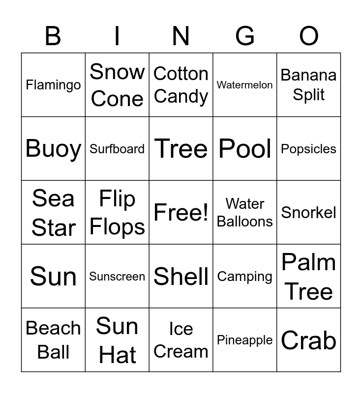 This bingo card has a free space and 29 words: Beach Ball, Chalk, Flip Flops, Sand Castle, Flamingo, Cotton Candy, Surfboard, Sunscreen, Water Balloons, Sun Hat, Snorkel, Crab, Ice Cream, Pineapple, Popsicles, Sunglasses, Shell, Sun, Banana Split, Sea Star, Camping, Kayak, Pool, Buoy, Watermelon, Snow Cone, Palm Tree, Tree and Beach.