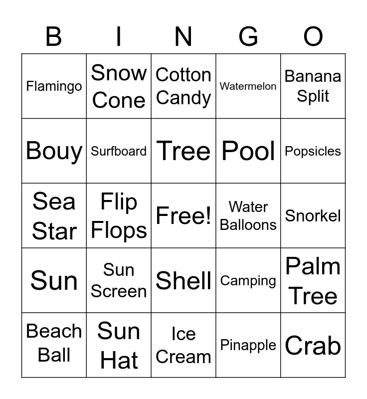 This bingo card has a free space and 29 words: Beach Ball, Chalk, Flip Flops, Sand Castle, Flamingo, Cotton Candy, Surfboard, Sun Screen, Water Balloons, Sun Hat, Snorkel, Crab, Ice Cream, Pinapple, Popsicles, Sunglasses, Shell, Sun, Banana Split, Sea Star, Camping, Kayak, Pool, Bouy, Watermelon, Snow Cone, Palm Tree, Tree and Beach.