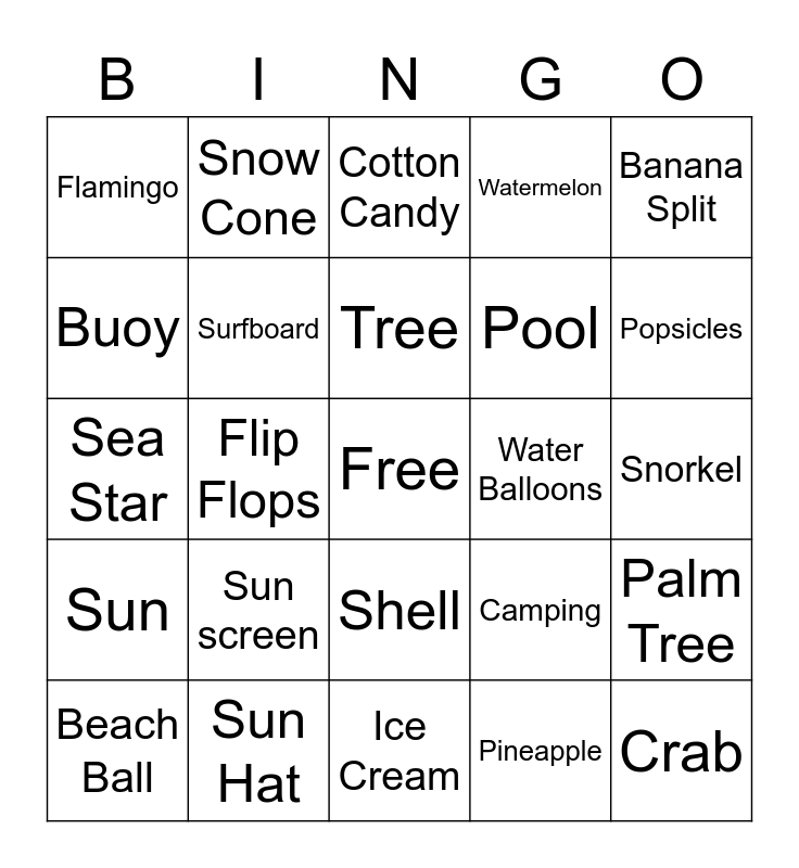 This bingo card has a free space and 29 words: Beach Ball, Chalk, Flip Flops, Sand Castle, Flamingo, Cotton Candy, Surfboard, Sun screen, Water Balloons, Sun Hat, Snorkel, Crab, Ice Cream, Pineapple, Popsicles, Sunglasses, Shell, Sun, Banana Split, Sea Star, Camping, Kayak, Pool, Buoy, Watermelon, Snow Cone, Palm Tree, Tree and Beach.