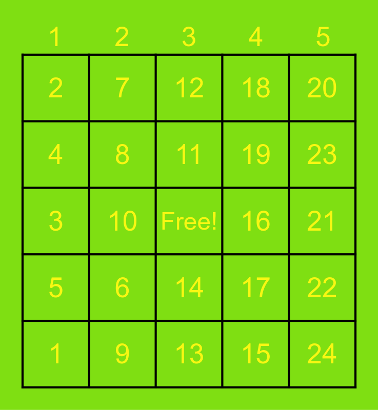 This bingo card has a free space and 24 words: 1, 6, 11, 15, 20, 2, 7, 12, 16, 21, 3, 8, 17, 22, 4, 9, 13, 18, 23, 5, 10, 14, 19 and 24.