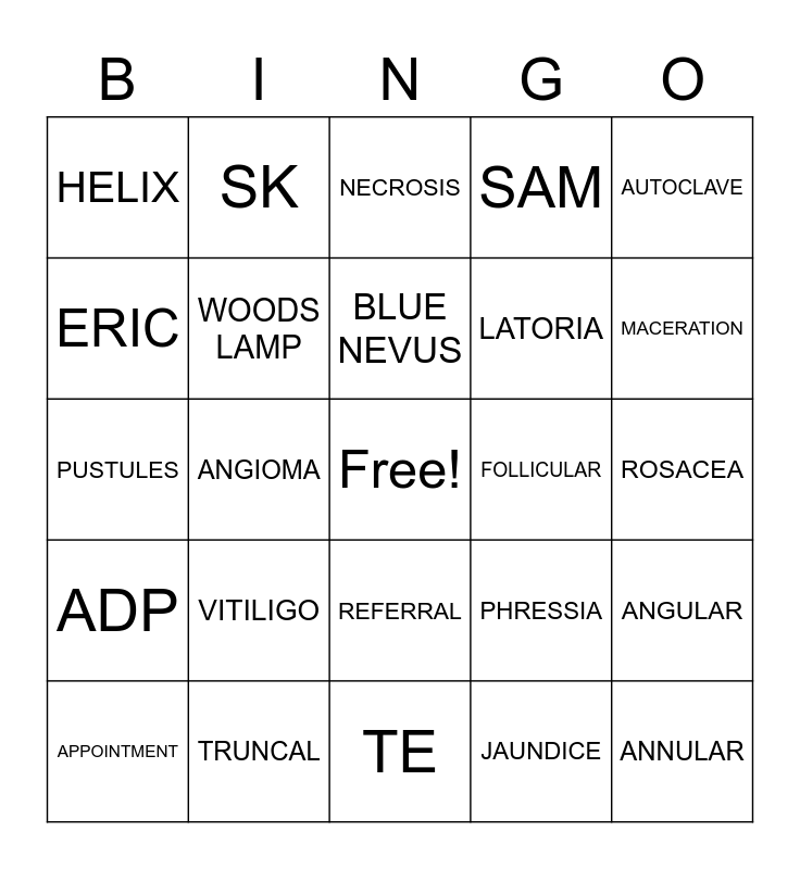 This bingo card has a free space and 29 words: APPOINTMENT, LIQUID NITROGEN, ANGIOMA, SQUAMOUS CELL, HELIX, NECROSIS, WOODS LAMP, VITILIGO, FOLLICULAR, TRUNCAL, ROSACEA, ANNULAR, TE, JAUNDICE, MACERATION, FISSURE, REFERRAL, ADP, AUTOCLAVE, PUSTULES, PHRESSIA, AK, LATORIA, ERIC, SAM, SK, ANGULAR, BLUE NEVUS and COVID.