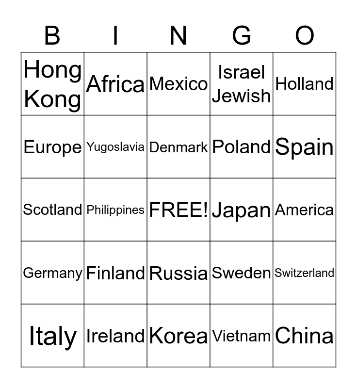 This bingo card has a free space and 24 words: Finland, Ireland, Denmark, Italy, Holland, Hong Kong, Europe, Africa, Japan, Russia, Poland, Scotland, Sweden, Switzerland, Yugoslavia, Vietnam, America, Mexico, Spain, Philippines, China, Germany, Israel Jewish and Korea.