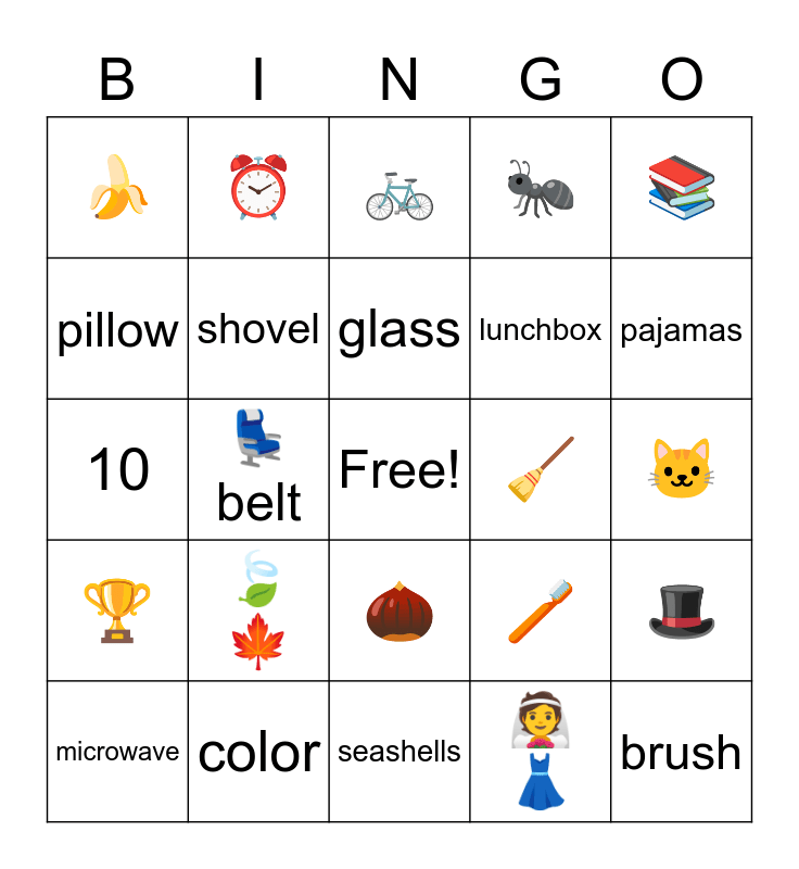 This bingo card has a free space and 24 words: ๐ ๐, color, glass, microwave, ๐, ๐, pillow, โฐ, ๐งน, ๐ฐ, lunchbox, 10, ๐ชฅ, ๐ฉ, shovel, ๐ฐ ๐, ๐ฑ, ๐ฒ, pajamas, ๐บ belt, brush, ๐, ๐ and seashells.
