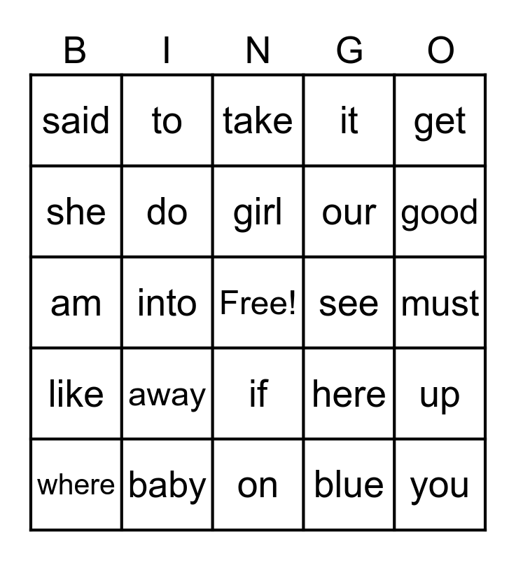 This bingo card has a free space and 29 words: where, small, into, so, said, take, do, away, see, baby, must, you, on, blue, good, please, if, like, get, am, here, come, our, she, it, to, up, girl and boy.