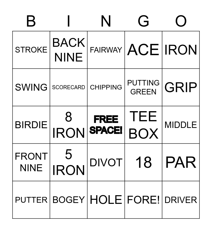 This bingo card has a free space and 24 words: 5 IRON, BOGEY, CHIPPING, PUTTER, IRON, STROKE, SWING, BACK NINE, TEE BOX, DIVOT, PUTTING GREEN, BIRDIE, 18, PAR, SCORECARD, FORE!, MIDDLE, FAIRWAY, GRIP, 8 IRON, DRIVER, FRONT NINE, ACE and HOLE.