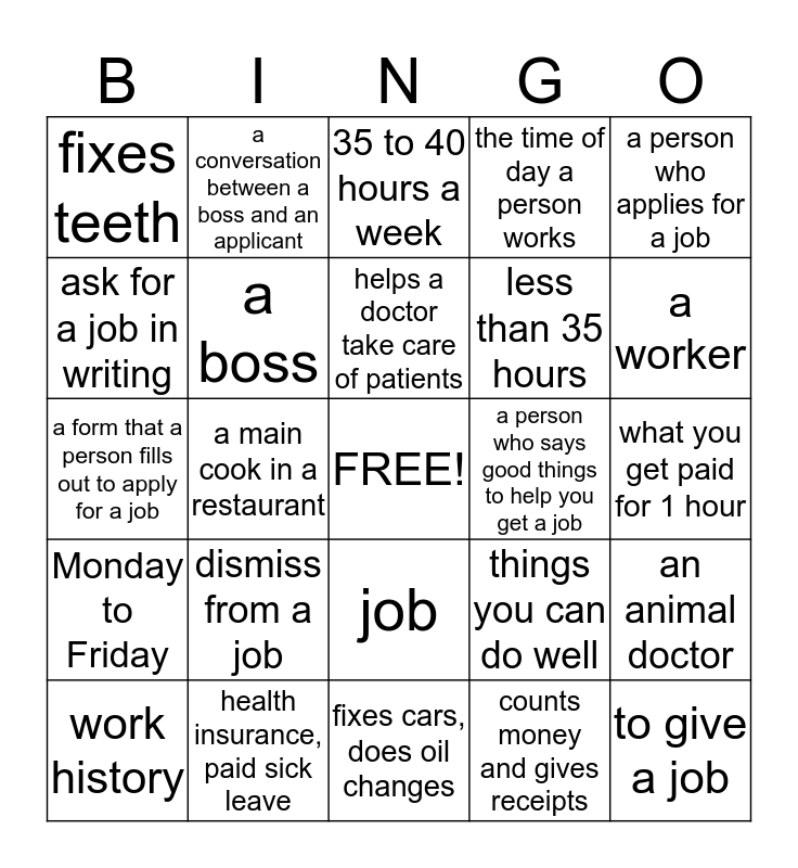 This bingo card has a free space and 24 words: dismiss from a job, health insurance, paid sick leave, helps a doctor take care of patients, work history, a person who applies for a job, fixes teeth, ask for a job in writing, a conversation between a boss and an applicant, a person who says good things to help you get a job, job, less than 35 hours, a form that a person fills out to apply for a job, things you can do well, an animal doctor, a boss, counts money and gives receipts, what you get paid for 1 hour, 35 to 40 hours a week, a worker, a main cook in a restaurant, to give a job, Monday to Friday, the time of day a person works and fixes cars, does oil changes.