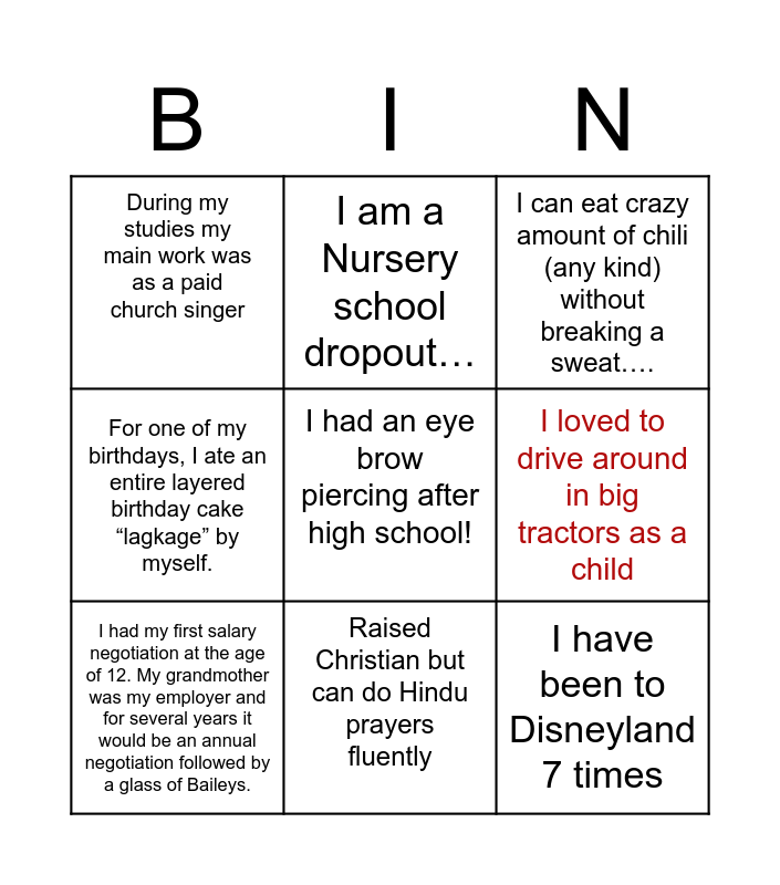 This bingo card has a free space and 8 words: I loved to drive around in big tractors as a child, I can eat crazy amount of chili (any kind) without breaking a sweat…., I am a Nursery school dropout…, I had my first salary negotiation at the age of 12. My grandmother was my employer and for several years it would be an annual negotiation followed by a glass of Baileys., During my studies my main work was as a paid church singer, I have been to Disneyland 7 times, For one of my birthdays, I ate an entire layered birthday cake “lagkage” by myself. and Raised Christian but can do Hindu prayers fluently.