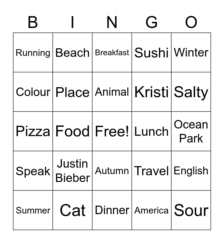 This bingo card has a free space and 44 words: United Kingdom, Sour, Mountain, Summer, Dog, America, Breakfast, Hot, Winter, Cat, Sushi, Lunch, Autumn, Justin Bieber, Sweet, Dinner, Cold, Pizza, Swimming, Salty, Beach, Spring, Thailand, Running, Disney, Ocean Park, Hong Kong, Japan, Travel, Speak, Language, English, French, Drink, Food, Favourite, Cartoon, Singer, Animal, Colour, Kristi, Liz, Place and Quiz.