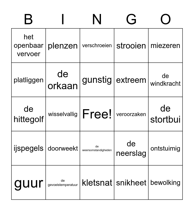 This bingo card has a free space and 24 words: doorweekt, de gevoelstemperatuur, gunstig, guur, miezeren, het openbaar vervoer, platliggen, plenzen, veroorzaken, de weersomstandigheden, extreem, de hittegolf, de neerslag, ontstuimig, de orkaan, snikheet, de stortbui, verschroeien, de windkracht, wisselvallig, bewolking, ijspegels, strooien and kletsnat.