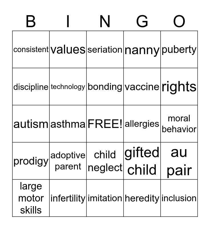 This bingo card has a free space and 24 words: adoptive parent, infertility, bonding, large motor skills, puberty, consistent, discipline, values, allergies, child neglect, vaccine, autism, gifted child, au pair, technology, heredity, moral behavior, seriation, rights, asthma, inclusion, prodigy, nanny and imitation.