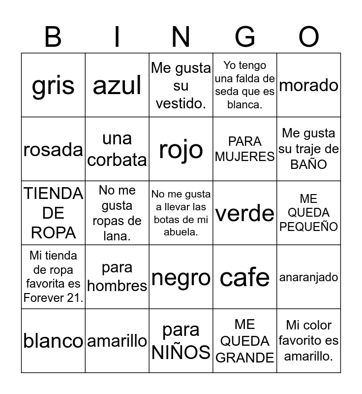 This bingo card has a free space and 24 words: para hombres, amarillo, rojo, blanco, morado, gris, rosada, azul, verde, negro, PARA MUJERES, TIENDA DE ROPA, cafe, anaranjado, una corbata, ME QUEDA GRANDE, ME QUEDA PEQUEÑO, Me gusta su vestido., Me gusta su traje de BAÑO, No me gusta ropas de lana., Mi color favorito es amarillo., Mi tienda de ropa favorita es Forever 21., Yo tengo una falda de seda que es blanca. and para NIÑOS.