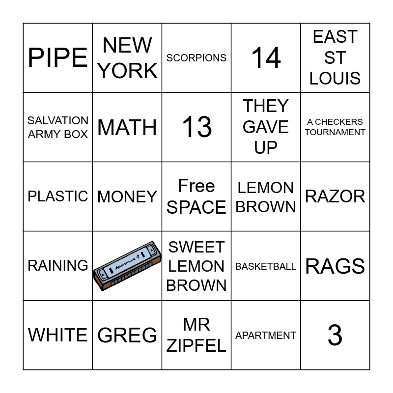 This bingo card has 1 images, a free space and 23 words: GREG, 13, WHITE, EAST ST LOUIS, PIPE, SALVATION ARMY BOX, NEW YORK, LEMON BROWN, SWEET LEMON BROWN, THEY GAVE UP, PLASTIC, BASKETBALL, RAGS, MATH, APARTMENT, RAZOR, SCORPIONS, A CHECKERS TOURNAMENT, MONEY, 3, RAINING, 14 and MR ZIPFEL.