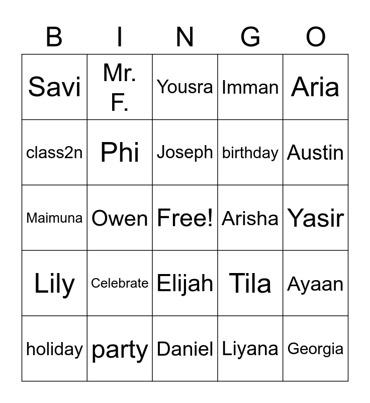 This bingo card has a free space and 24 words: Celebrate, party, Joseph, holiday, Aria, Savi, class2n, Mr. F., Arisha, Elijah, birthday, Maimuna, Tila, Ayaan, Phi, Liyana, Yasir, Yousra, Austin, Owen, Georgia, Lily, Imman and Daniel.