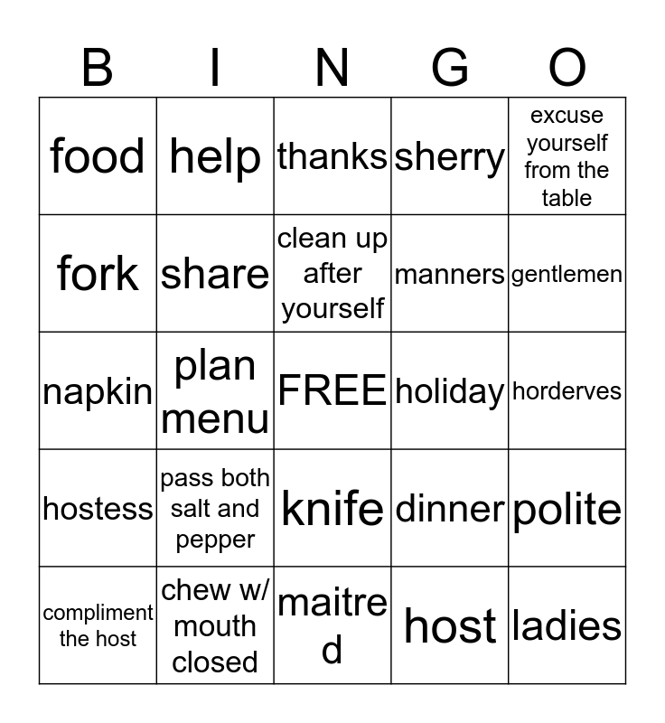 This bingo card has a free space and 24 words: pass both salt and pepper, chew w/ mouth closed, clean up after yourself, compliment the host, excuse yourself from the table, food, fork, help, holiday, knife, manners, napkin, dinner, polite, share, host, horderves, thanks, gentlemen, plan menu, ladies, hostess, sherry and maitre d.