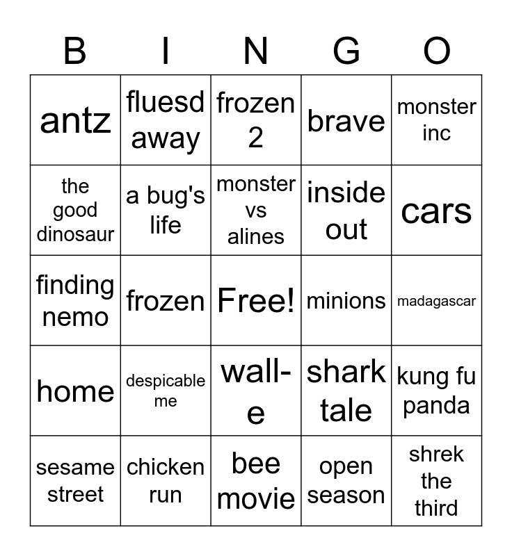 This bingo card has a free space and 29 words: sesame street, toy story, frozen, shrek, antz, frozen 2, a bug's life, despicable me, minions, chicken run, madagascar, shrek the third, bee movie, open season, cars, up, wall-e, home, monster inc, finding nemo, shark tale, incredibles, inside out, the good dinosaur, brave, fluesd away, kung fu panda, monster vs alines and robots.