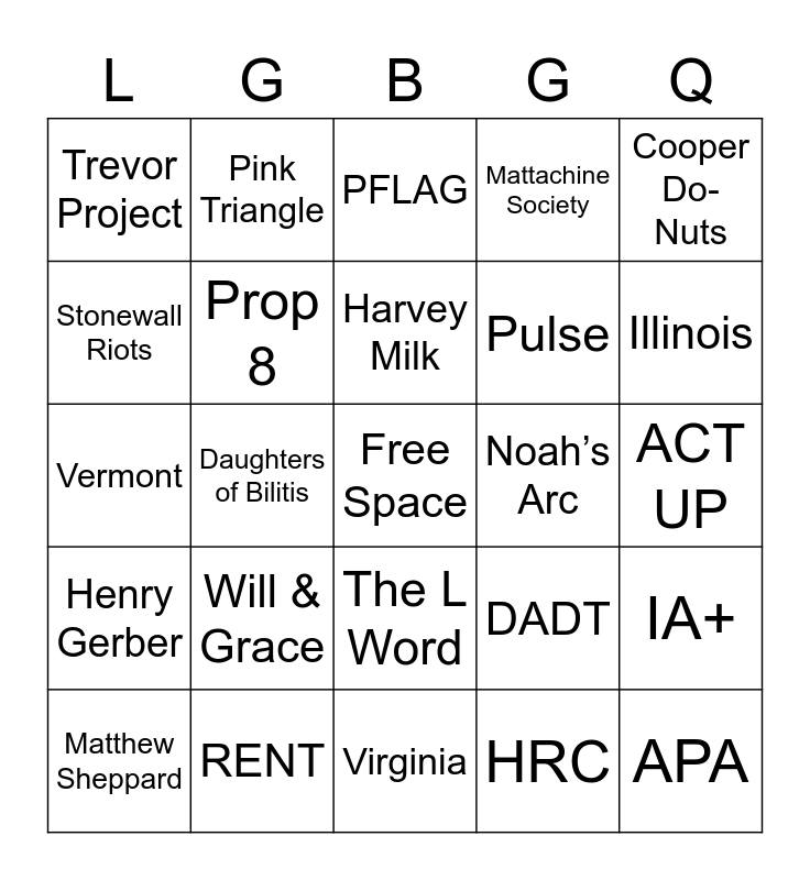 This bingo card has a free space and 40 words: Red Ribbon, Vermont, Massachusetts, Prop 8, RENT, The L Word, Harvey Milk, Colors, Cooper Do-Nuts, Henry Gerber, Daughters of Bilitis, Mattachine Society, APA, ACT UP, Noah’s Arc, Will & Grace, Ellen, Trevor Project, March 31, PFLAG, IA+, HRC, Pulse, Stonewall Riots, Compton Cafe, GRID, 69%, DOMA, Obergefell Decision, Bostock Decision, Gilbert Baker, Matthew Sheppard, EO 10450, DADT, Illinois, Virginia, 191,000, 100,000, Pink Triangle and Pronouns.