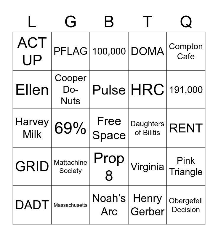 This bingo card has a free space and 40 words: Pronouns, Harvey Milk, Colors, Cooper Do-Nuts, Massachusetts, Prop 8, Pulse, Stonewall Riots, Compton Cafe, GRID, 69%, DOMA, Obergefell Decision, RENT, Daughters of Bilitis, Mattachine Society, APA, ACT UP, Red Ribbon, 100,000, Pink Triangle, Henry Gerber, HRC, Ellen, Trevor Project, Vermont, The L Word, Bostock Decision, Gilbert Baker, Matthew Sheppard, EO 10450, DADT, Illinois, Virginia, 191,000, Noah’s Arc, Will & Grace, March 31, PFLAG and IA+.