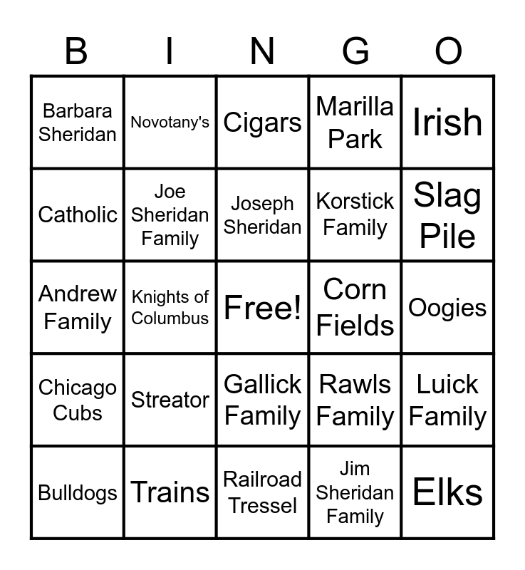 This bingo card has a free space and 24 words: Streator, Trains, Joseph Sheridan, Bulldogs, Irish, Barbara Sheridan, Catholic, Novotany's, Corn Fields, Gallick Family, Korstick Family, Andrew Family, Rawls Family, Luick Family, Joe Sheridan Family, Jim Sheridan Family, Oogies, Cigars, Slag Pile, Knights of Columbus, Elks, Chicago Cubs, Marilla Park and Railroad Tressel.