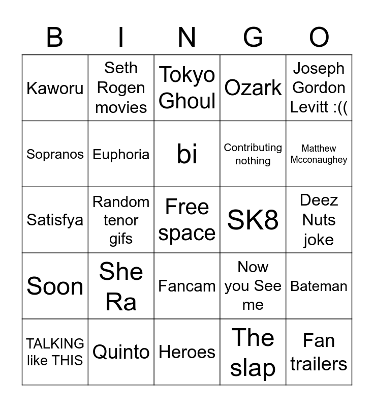 This bingo card has a free space and 24 words: She Ra, Quinto, bi, TALKING like THIS, Joseph Gordon Levitt :((, Kaworu, Sopranos, Seth Rogen movies, SK8, Fancam, Contributing nothing, Satisfya, Now you See me, Bateman, Euphoria, The slap, Deez Nuts joke, Tokyo Ghoul, Matthew Mcconaughey, Random tenor gifs, Fan trailers, Soon, Ozark and Heroes.
