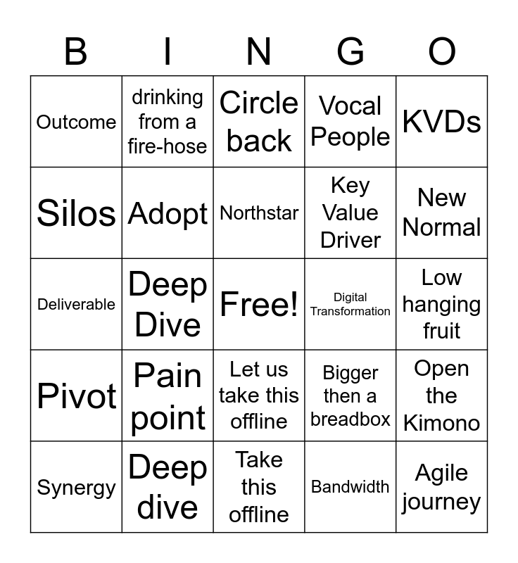 This bingo card has a free space and 46 words: Can you see my screen, Agile journey, Flowcharts, Take this offline, Pain point, Value add, drinking from a fire-hose, Change Enablement, Silos, Implement, Adopt, Vocal People, Open the Kimono, Bigger then a breadbox, Quick Win, Is that part of BOSS?, Northstar, Digital Transformation, Tailwind, KVDs, Deep Dive, Bandwidth, Outcome, Key Value Driver, Optimus, New Normal, Synergy, Circle Back, Let us take this offline, Pivot, Think Outside The Box, PTC: Prepare to Change, Zoom, New Normal, Per my last email…., Deep dive, Low hanging fruit, We’re Agile, Over-capacity, We’re a few mins after the hour…. Lets give everyone another minute to join, I’ll give everyone a few mins back to their day, Circle back, Deliverable, Level-set expectations, At your earliest convenience and LOE.