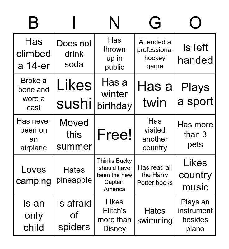 This bingo card has a free space and 29 words: Is an only child, Lives in Castle Rock, Moved this summer, Can do a handstand, Has climbed a 14-er, Has thrown up in public, Likes sushi, Hates pineapple, Has visited another country, Is afraid of spiders, Has more than 3 pets, Plays an instrument besides piano, Likes Elitch's more than Disney, Hates swimming, Plays a sport, Has lived in another state, Thinks Bucky should have been the new Captain America, Loves camping, Is left handed, Has never been on an airplane, Has read all the Harry Potter books, Has seen every Star Wars movie, Has a twin, Broke a bone and wore a cast, Attended a professional hockey game, Does not drink soda, Likes country music, Has a winter birthday and Is going to another LuHi camp this summer.